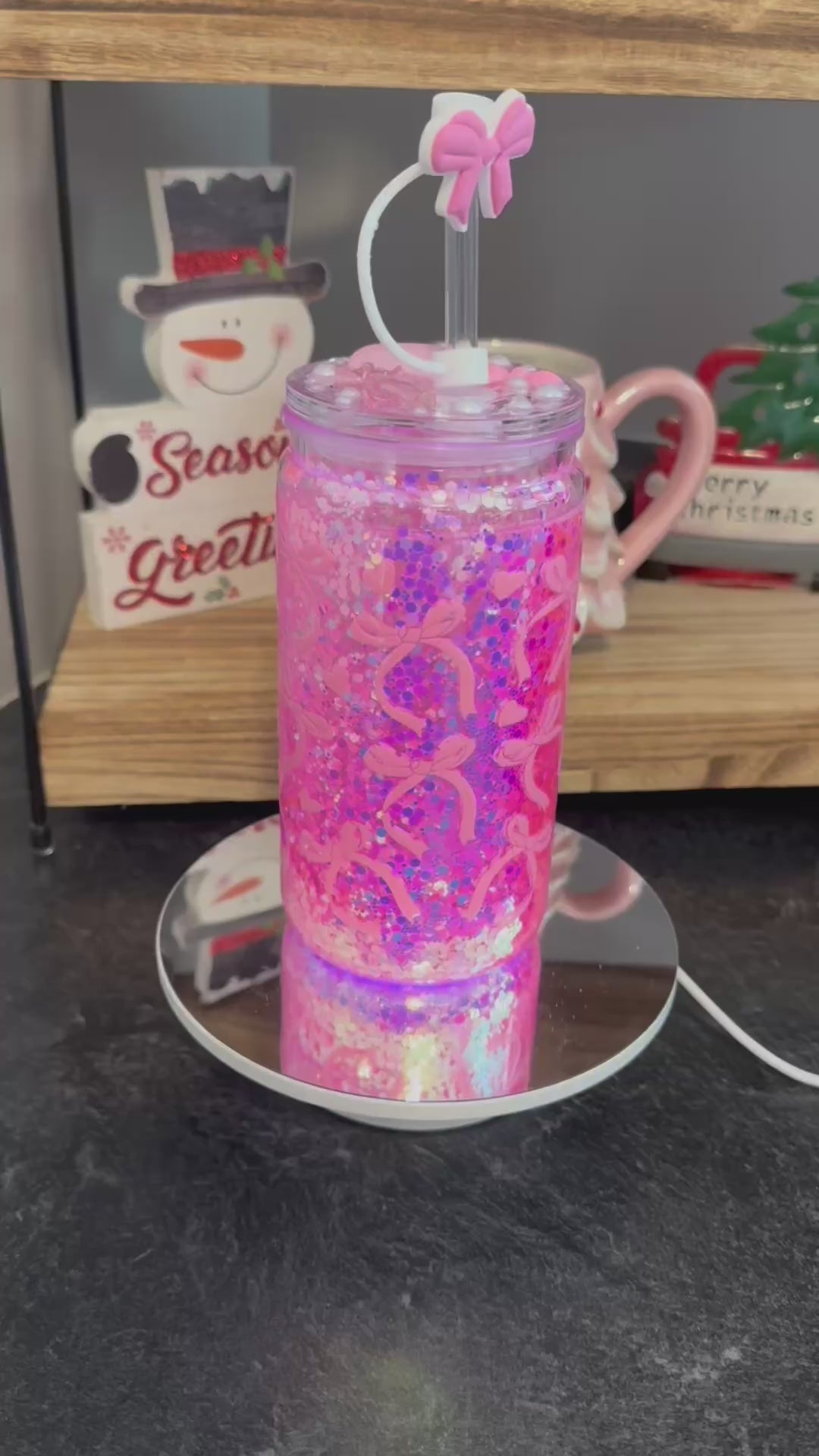 ⨠16oz Acrylic Snowglobe Cup with Glitter Effect & Pink Bows āØ