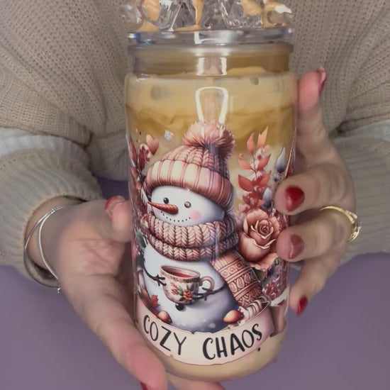 16oz Glass Cup with Swirl Effect, Christmas Snowman Design. Includes decorated lid and plastic straw.