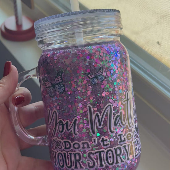 Sip in style with our charming 20oz Mason Jar, featuring a sparkling glitter effect and a cheerful sunflower and butterfly design. Perfect for iced beverages, smoothies, or refreshing water, this mason jar combines functionality with whimsical elegance. Its durable construction and secure lid make it ideal for everyday use or gifting to someone special.