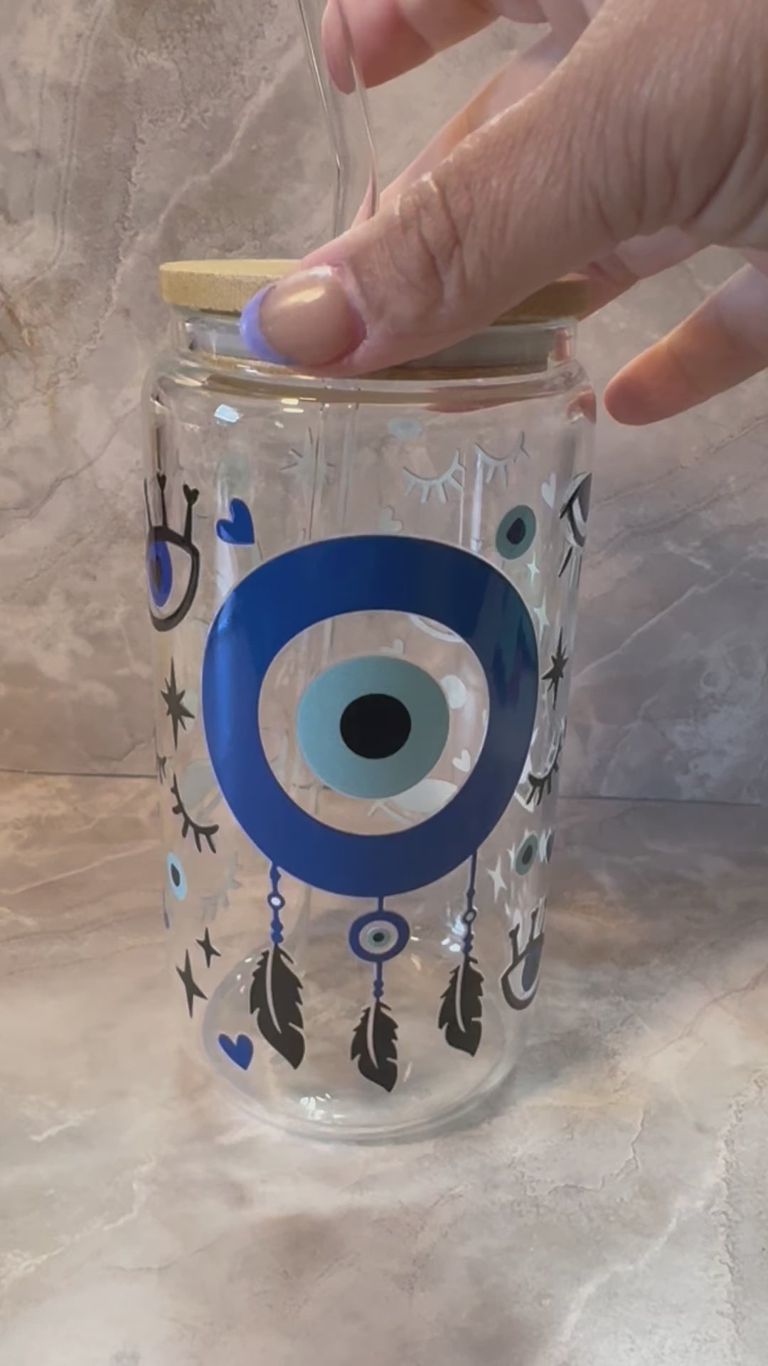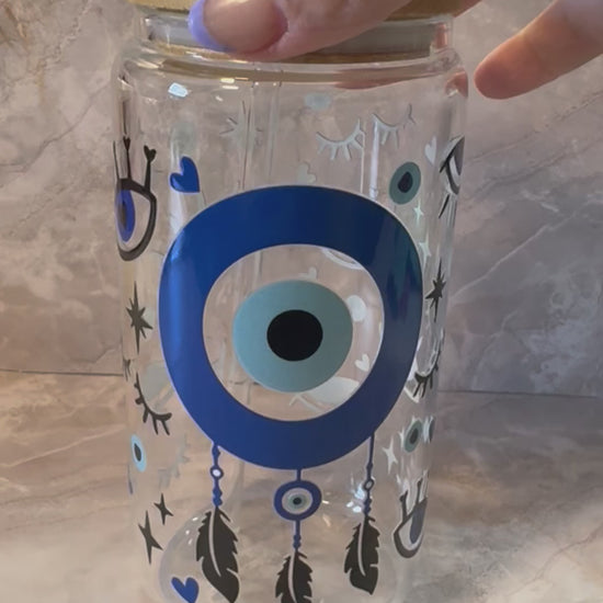 Pre-Made 16oz Evil Eye Glass Cup with Bamboo Lid and Glass Straw