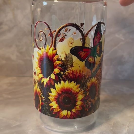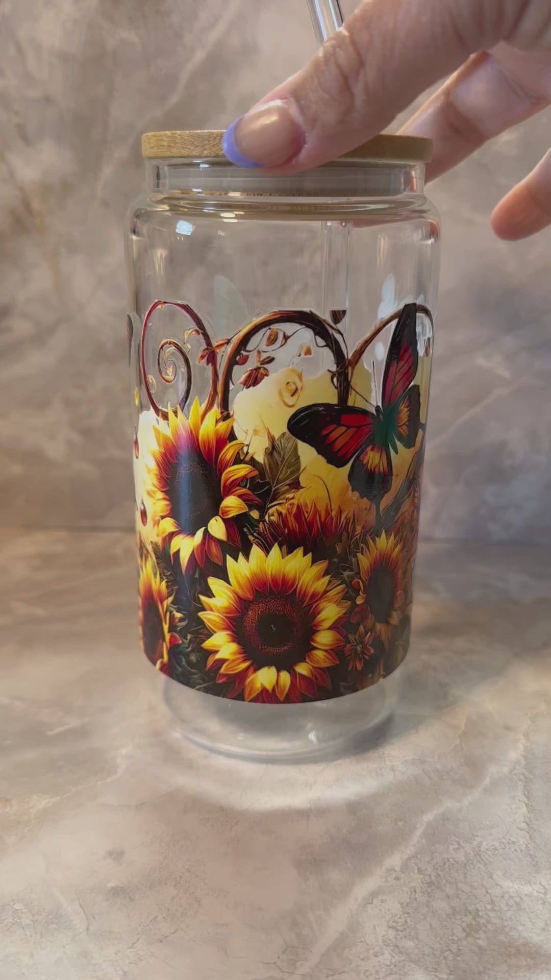 Pre-Made 16oz Sunflower Glass Cup with Bamboo Lid and Glass Straw